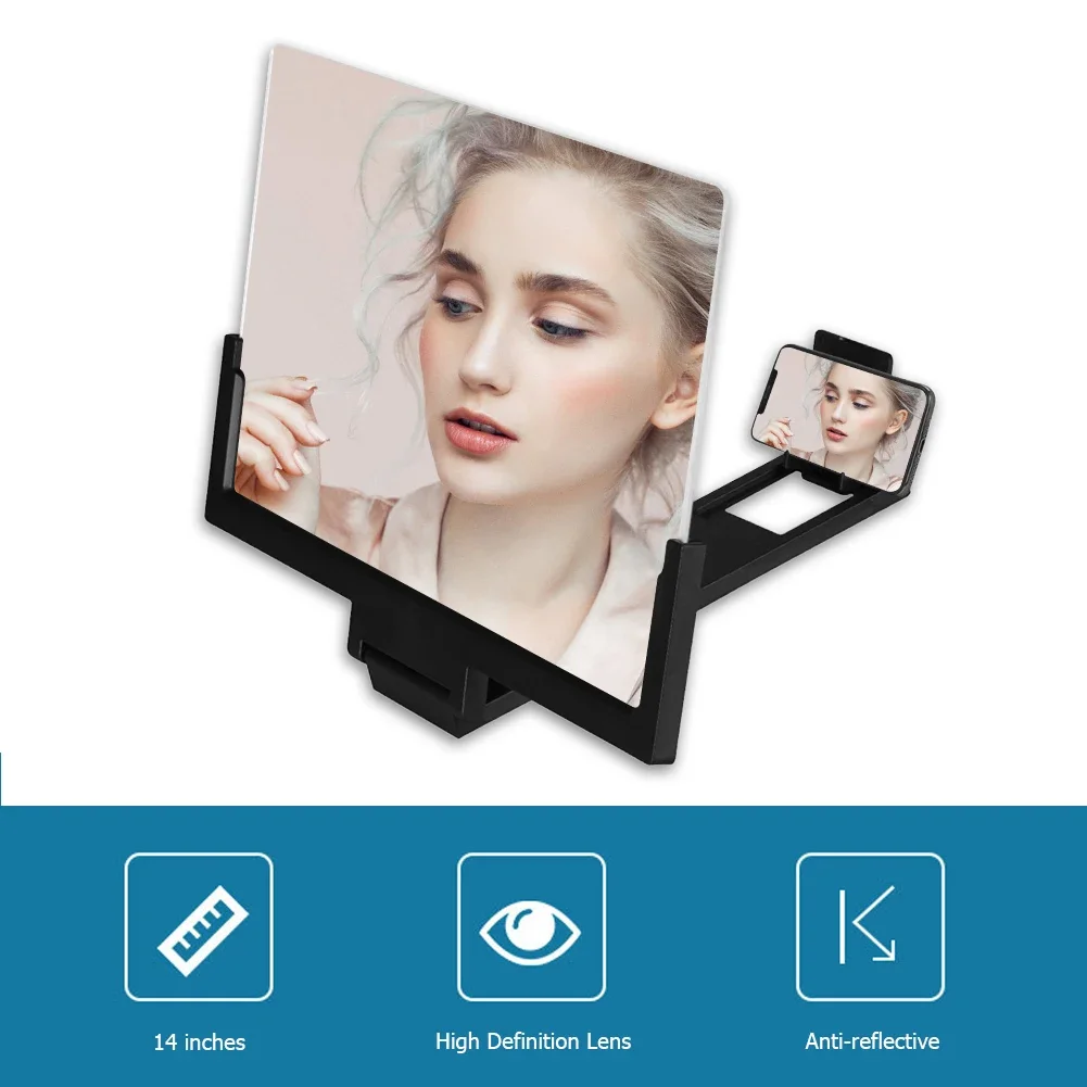 14 inch Mobile Phone HD Screen Amplifier Stereoscopic Magnifying Glass Foldable Phone Bracket Tablet Holder Feature: 1. Large screen, ultra high definition, radiation protection, UV protection, physical sound control, curved screen etc. 2. It uses the physical optical technology of film projection, adopts environmentally friendly ABS frame + high-definition acrylic lens, instantly magnifies the mobile phone screen by 3-5 times, and transmits light, transparent, and high-definition radiation to protect your eyes from being hurt. 3. The product is innovative, stylish and beautiful, and easy to carry. Whether it is at home, office, car, travel, it is your best choice. Specifications: Color: Black, White Material: ABS + Acrylic Magnification: 3-5 times Screen size: 295*177*30mm/11.61*6.97*1.18in Notes: 1. Please allow 1-3mm differs due to manual measurement. 2. Due to the different display and different light, the picture may not show the actual color of the item. Thanks for your understanding. 1 X Screen Magnifier 1 X Packing Case |