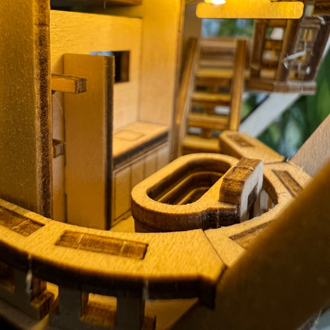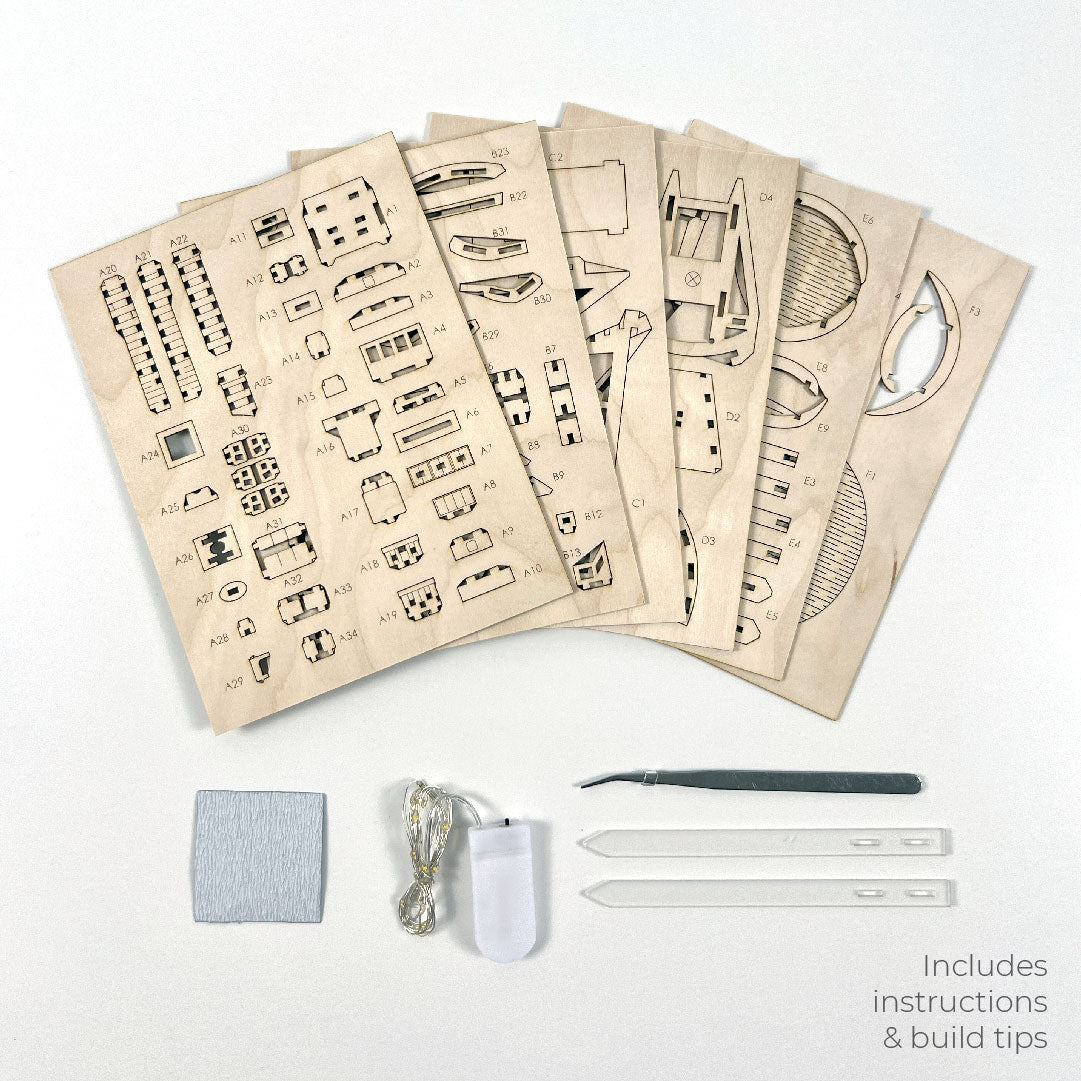 DIY wooden model kit with easy to follow instructions. Includes LED lights, acrylic stake (moisture resistant) and assembly tools.
