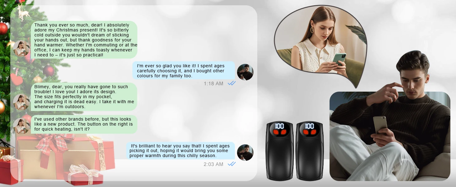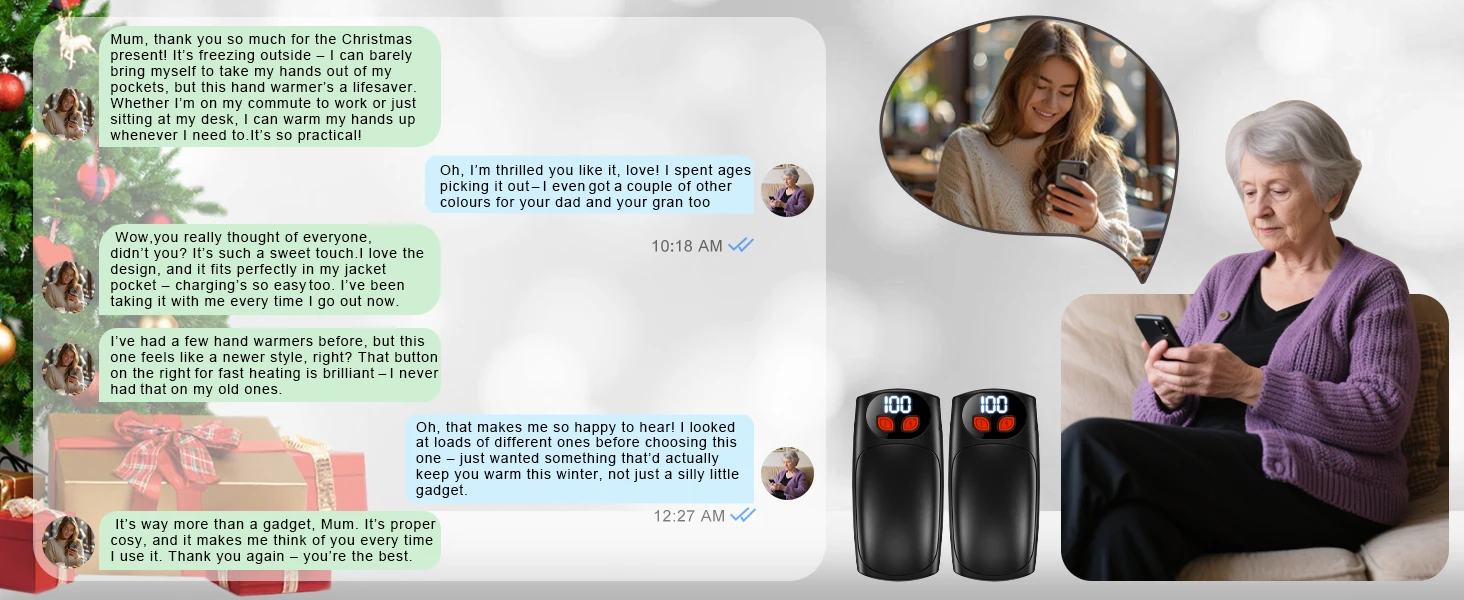 Larger Heating SurfaceThe upgraded hand warmers feature a significantly larger heating surface. Equipped with five heat settings, they'll keep you warm even on the coldest winter days.