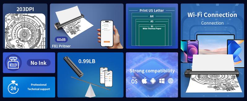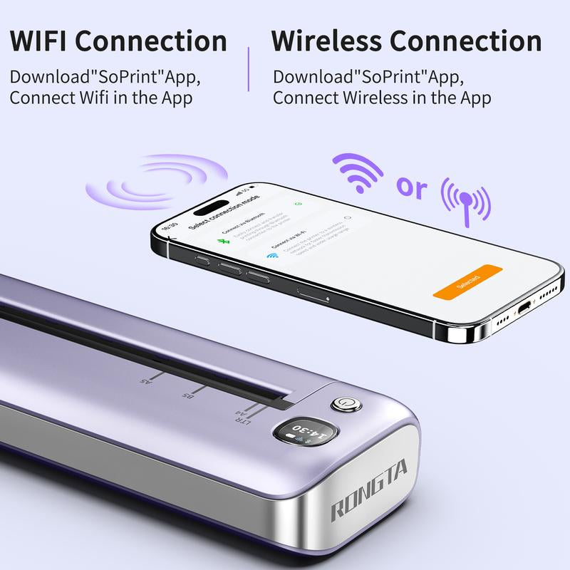 The RONGTA Portable Printers Wireless is perfect for travel. It supports 8.5" X 11" US Letter size, making it ideal for various printing needs. This Bluetooth thermal printer is inkless, ensuring hassle-free printing. Suitable for office and home use, it offers versatility and convenience.